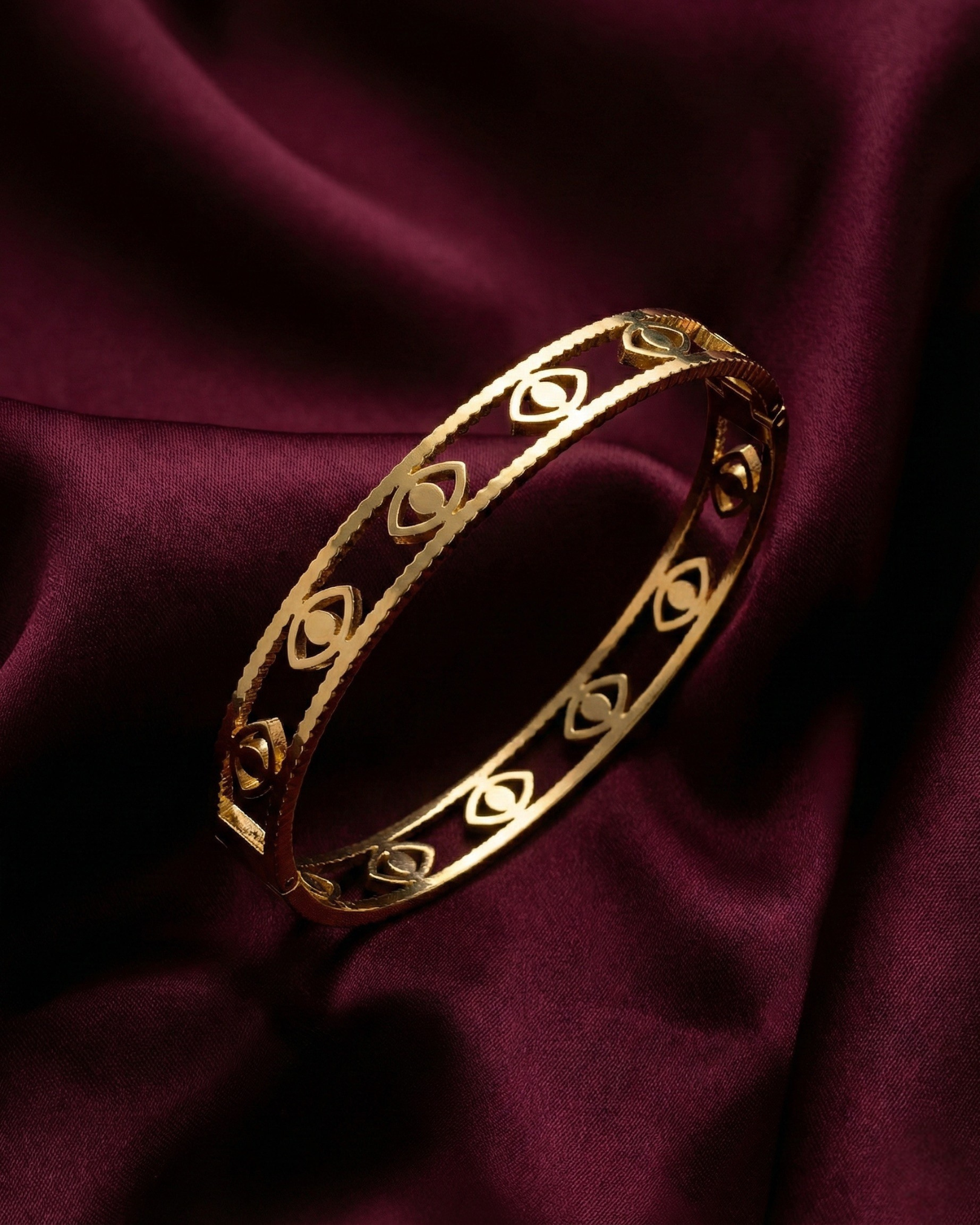 This exquisite 18k gold-plated bangle features a continuous, open-work cage design with intricately carved Evil Eye motifs. Each protective eye is centred on a brilliant, precision-cut crystal, creating a mesmerising, repeating pattern that symbolises constant guidance and wards off negativity.
